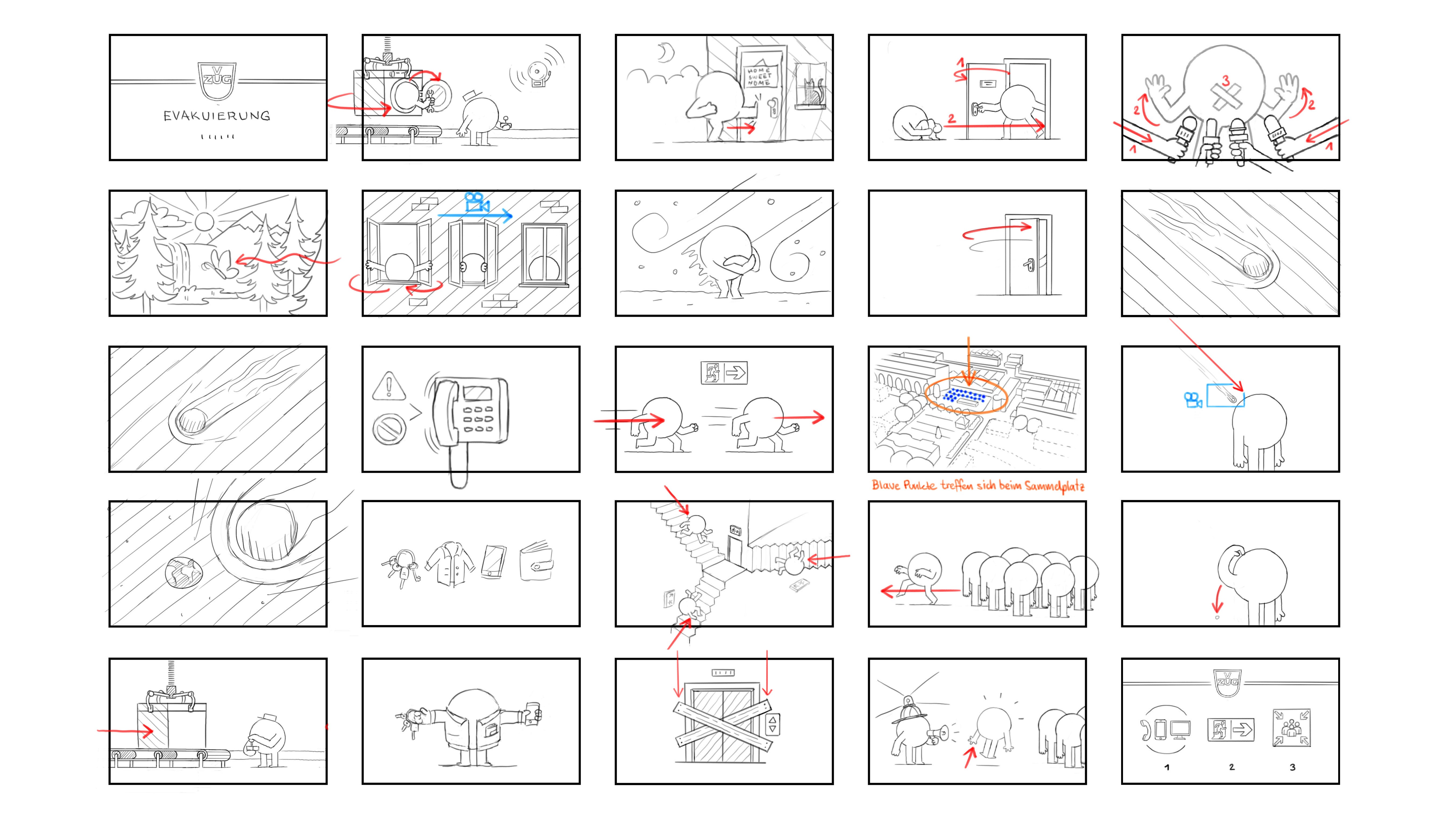 Das Storyboard war bei diesem Projekt mehr als nur Ablaufplanung – wir haben damit die Situationskomik getestet und geprüft, ob unsere Kugel-Charaktere wirklich alles transportieren können, was sie sollen.