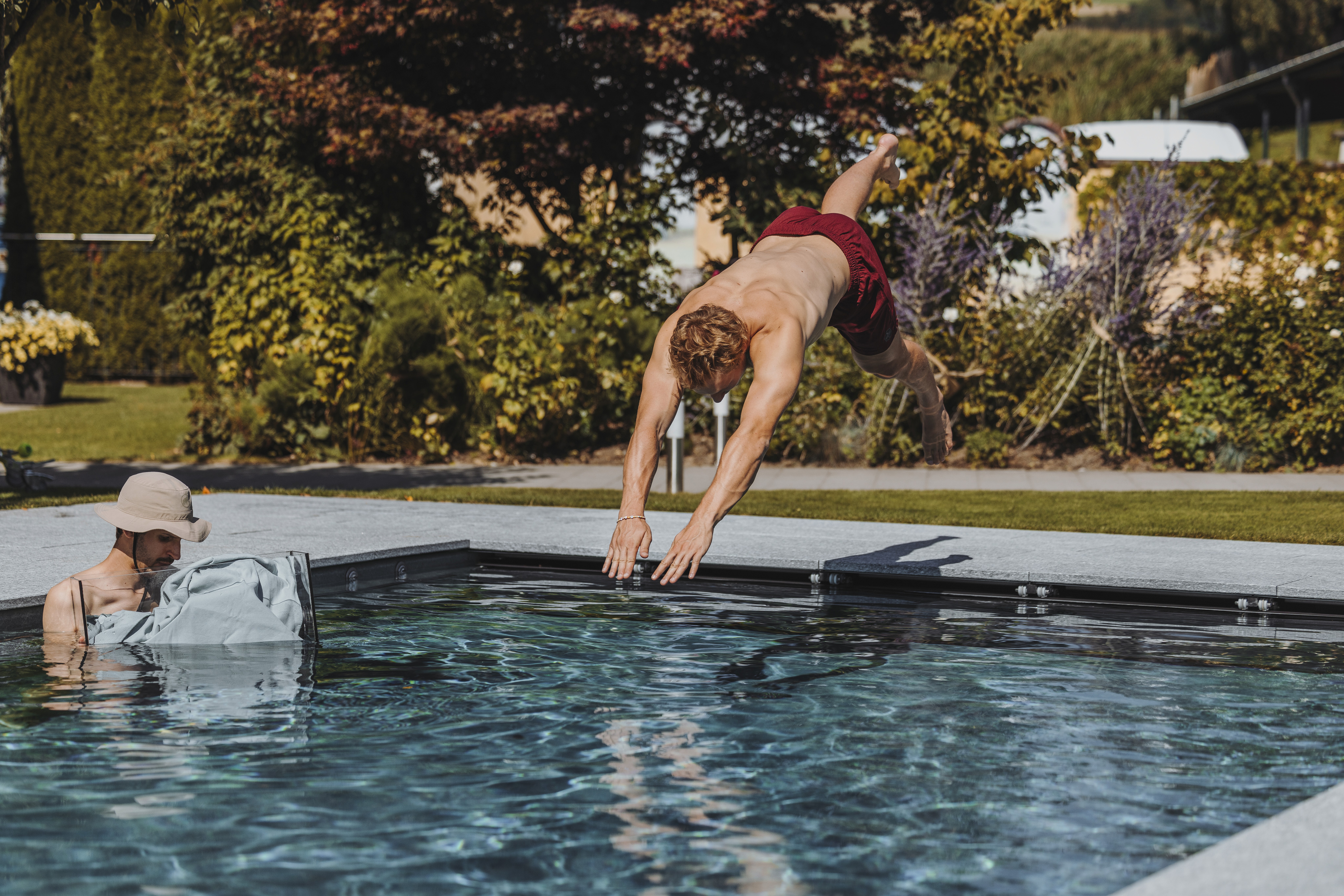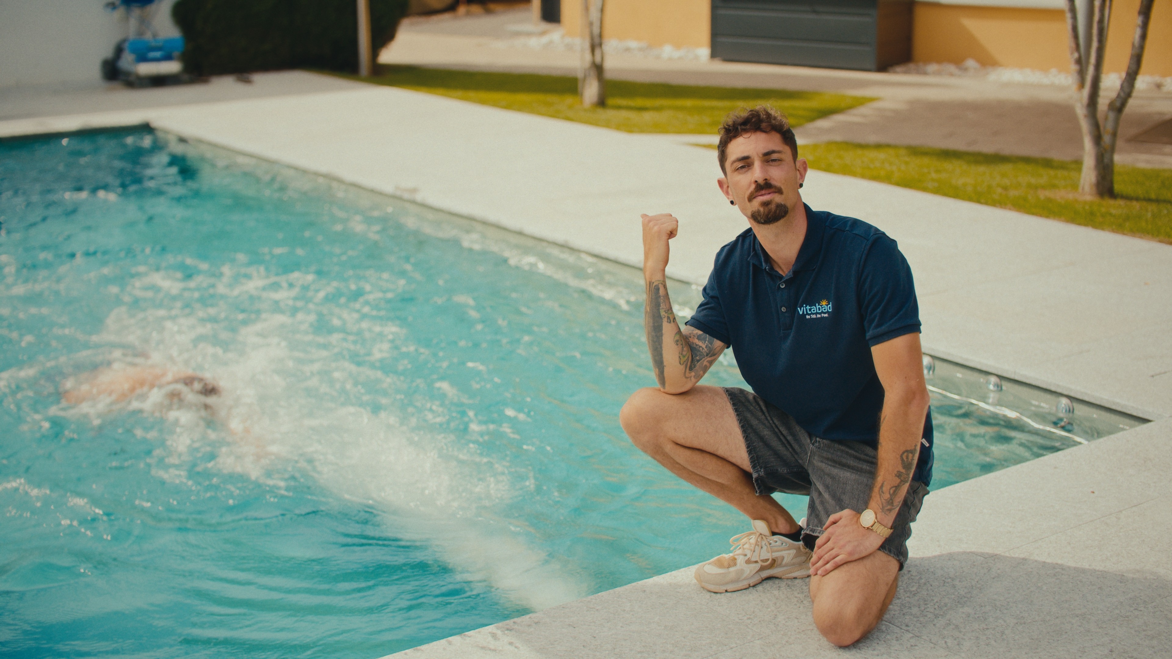 Marco eröffnet den Film so, wie man sich das wünscht: entspannt im Pool, kurzer Kopfsprung, fertig. Ab da übernimmt Scott – Projektleiter bei Vita Bad und das Herzstück des Films. Er führt uns durch alles, was Vita Bad ausmacht: von der Beratung über die eigene Produktion bis zum laufenden Unterhalt. Immer informativ, nie trocken. Zum Schluss sind wir wieder bei Marco – der eigentlich einfach nur in Ruhe seinen Pool geniessen möchte.